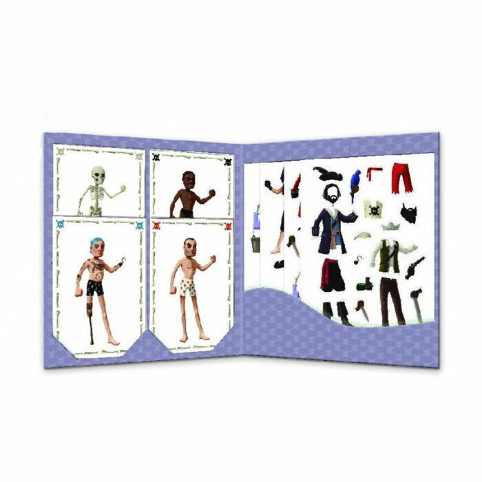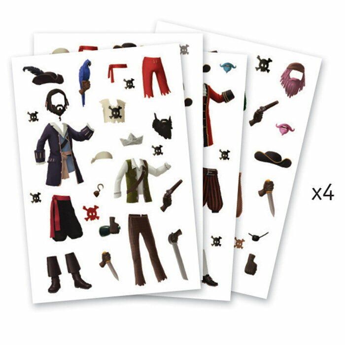 Descubra este pacote de adesivos reposicionáveis com tema de piratas! A Djeco criou adesivos de piratas para você se fantasiar, com 4 folhas de acessórios e roupas de pirata: tapa-olho, chapéu, jaqueta, faixa de cabeça, botas, cinto, pistola, espada e perna de pau. Esses adesivos reposicionáveis permitem que você mude a aparência dos piratas quantas vezes quiser!