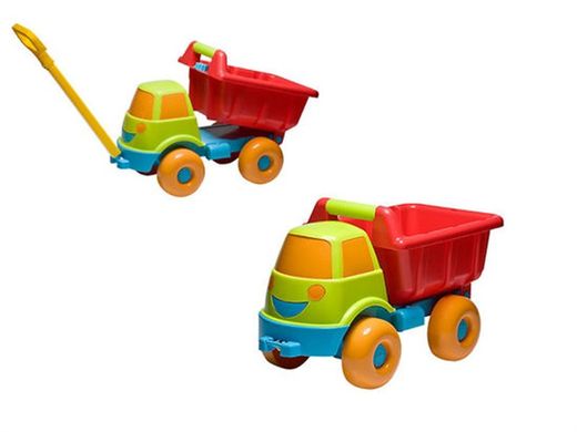 Feliz caminhão basculante com arrasto ideal para brincar na praia, no parque ou no jardim. Feliz caminhão basculante com arrasto de 49 cm de comprimento e 31 cm de altura. Ideal para os pequenos se divertirem brincando e transportando objetos no caminhão basculante. Caminhão plástico multicolorido para crianças maiores de 18 meses.