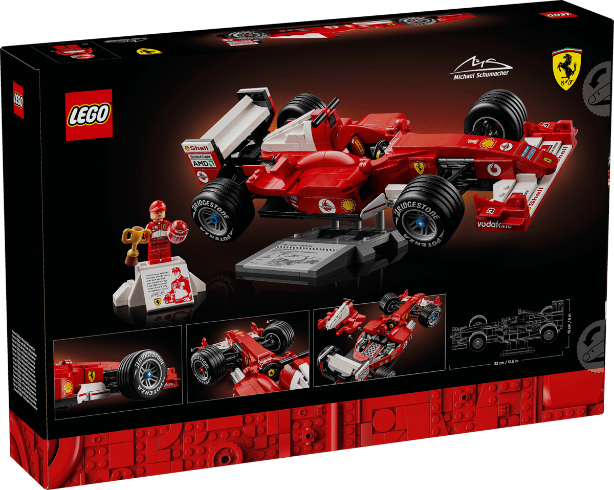 Celebre a era de ouro da Fórmula 1 com o kit LEGO® Icons Ferrari F2004 e Michael Schumacher (11375). Crie uma réplica em escala do carro de corrida que, com Michael Schumacher ao volante, dominou a temporada de 2004. A Ferrari inclui um mecanismo de direção funcional, pneus com sulcos e um motor V10 detalhado, além de uma base de exibição com informações e estatísticas do carro. A minifigura de Michael Schumacher vem com um capacete, um troféu e uma base em formato de pódio com uma imagem impressa e uma citação do heptacampeão mundial. Este modelo incrível é uma peça de exibição fascinante e um presente excelente para fãs de F1 e colecionadores de memorabilia da F1. Descubra os dinâmicos conjuntos de construção LEGO F1 (vendidos separadamente), projetados para adultos, crianças e famílias. Construa de forma mais inteligente com o aplicativo LEGO Builder: dê zoom e gire em 3D, acompanhe seu progresso e siga instruções digitais passo a passo. O conjunto contém 735 peças.