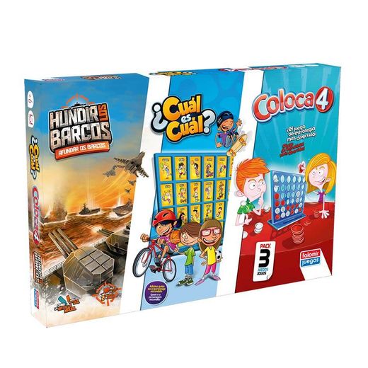 ¿No querías juego? Pues ahí van 3 juntos. El pack definitivo: Hundir los barcos, Cuál es Cuál y Coloca 4. Una combinación ganadora que os ofrecerá cantidad de momentos entretenidos. Coloca 4 es un atrevido juego de estrategia vertical que se puede aprender con facilidad. Las reglas son muy simples: cada jugador se propone colocar una fila de cuatro de sus fichas en el tablero (la fila puede ser vertical, horizontal o diagonal), e intentar impedir al mismo tiempo que tu adversario logre formar su fila primero. Es más difícil de lo que parece. La verticalidad del juego requiere astucia y estrategia. Este juego contiene un tablero, 22 fichas rojas y 22 fichas blancas. Hundir los barcos es un juego de estrategia para 2 jugadores. El objetivo es hundir todos los barcos de tu adversario. Solo vencerá la batalla naval el mejor capitán. Este juego contiene un tablero de juego y cada jugador dispone de una flota, 80 pivotes blancos y 40 pivotes rojos. Cuál es cuál: Diviértete adivinando que personaje ha elegido tu adversario. Para ello solo podrás hacer preguntas que su respuesta sea SI o NO. El también tendrá que adivinar que personaje has elegido tu. El primero que lo adivine será el ganador. Para empezar a jugar elegir una de las dos laminas que encontrarás en el juego y coloca dentro del tablero vertical. Cada jugador escogerá un personaje y por turnos iréis haciendo preguntas hasta conseguir adivinar el personaje del contrincante.